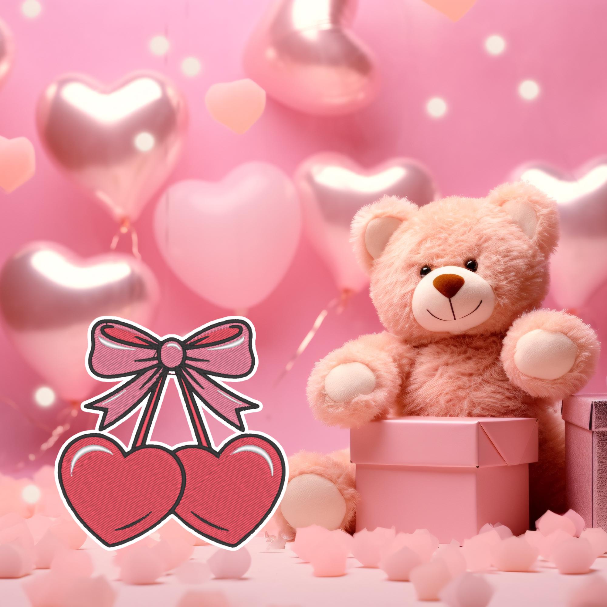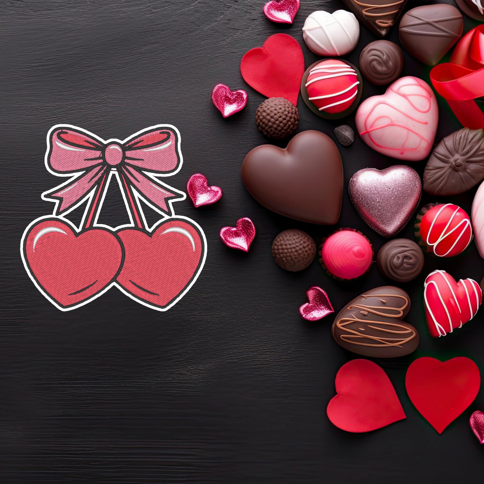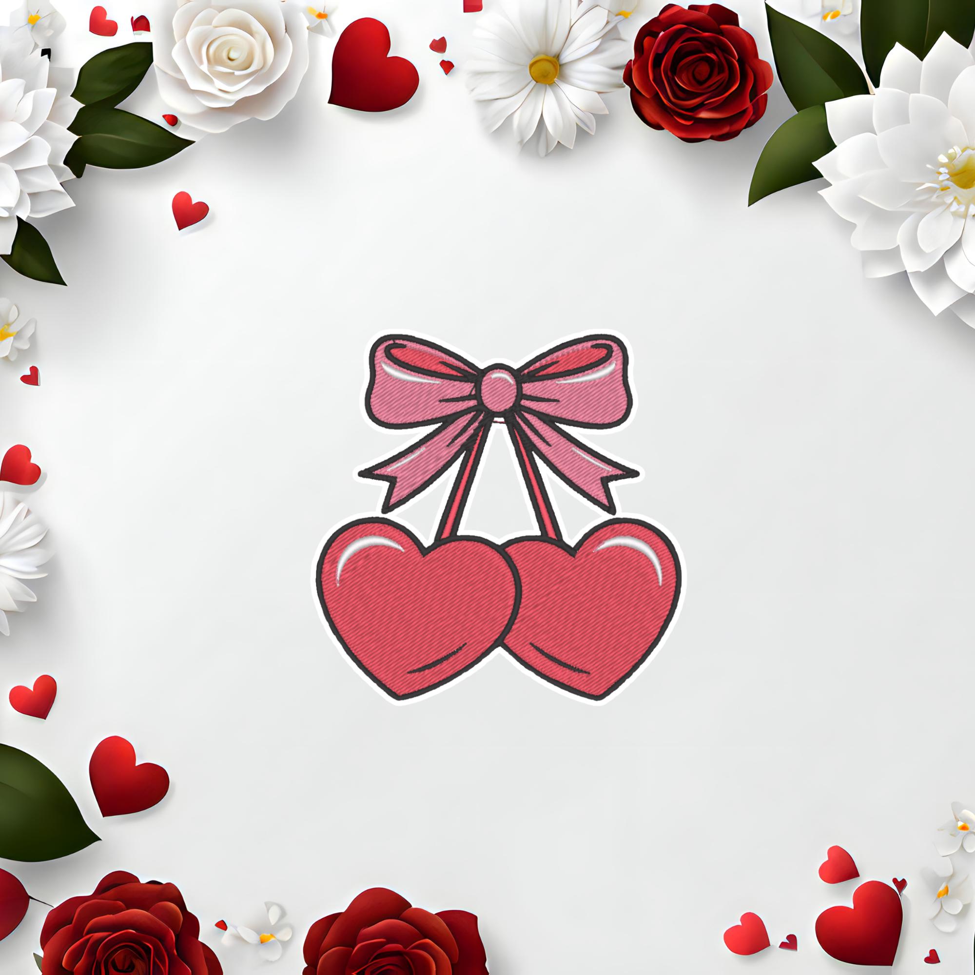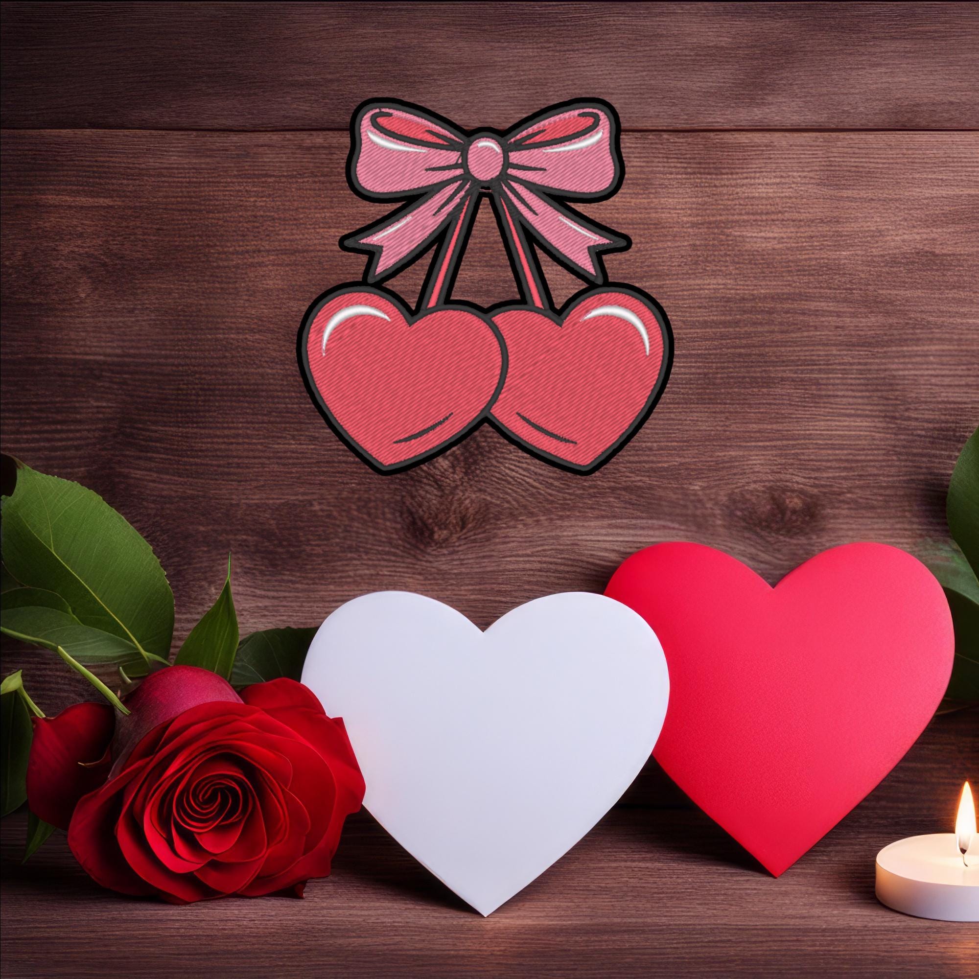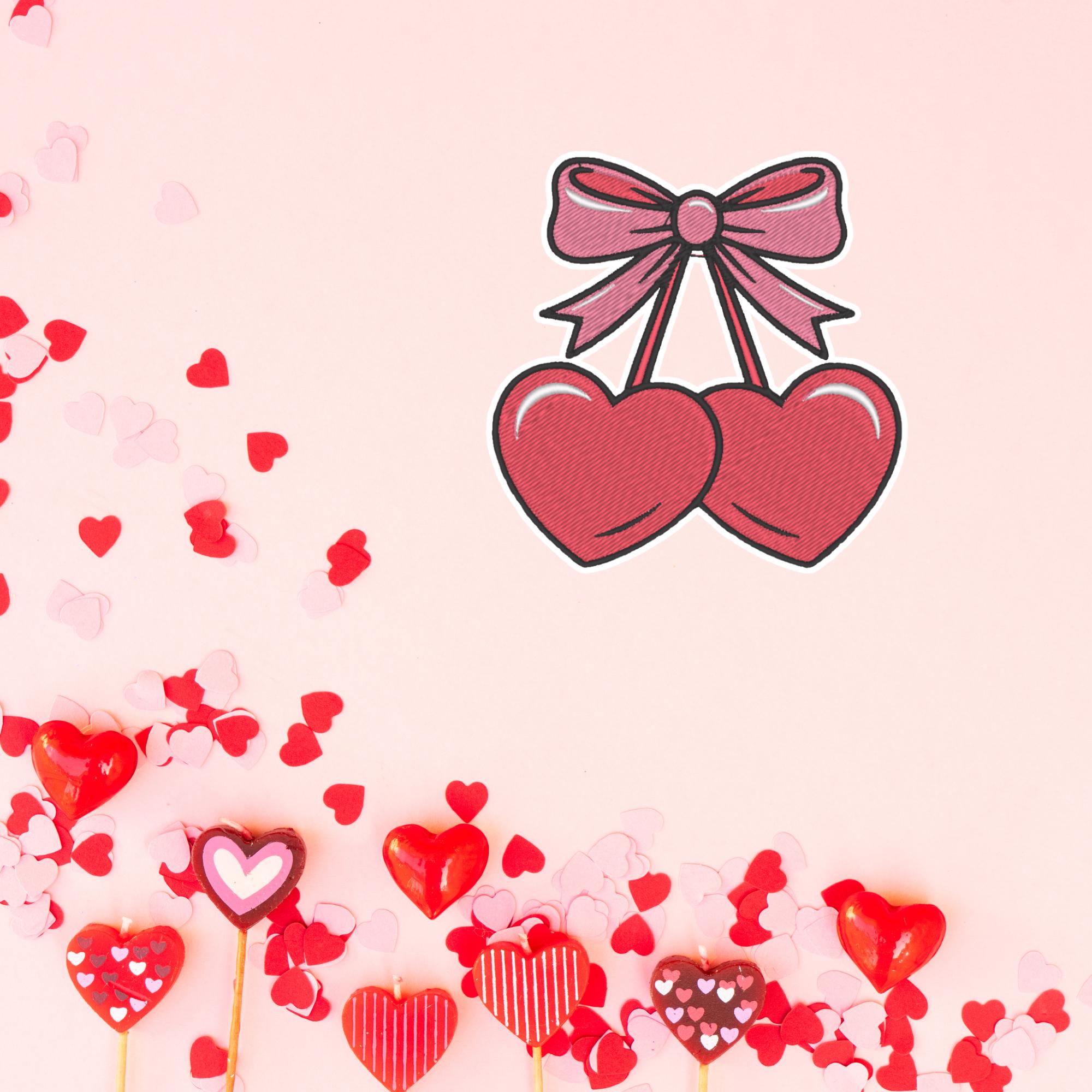 Valentine Iron-On Patch, Heart Cherries with Bow, Romantic Love Embroidery, 9x9 cm