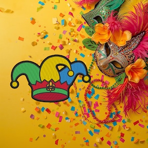 Enhance your festival wardrobe with this delightful jester applique and bring extra cheer to any carnival, Fasching, Mardi Gras, or themed party. Add this playful patch to your collection and turn everyday items into colorful, festive masterpieces!